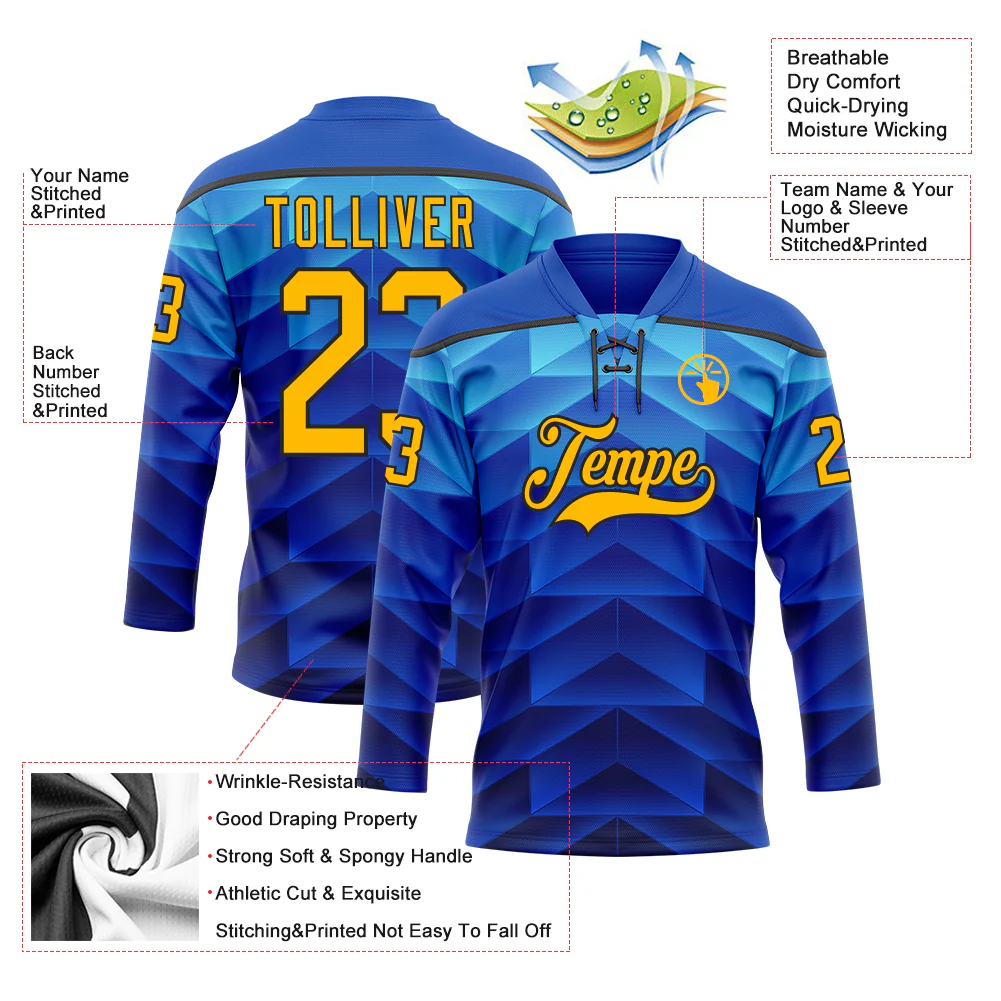Custom Blue Gold-Black 3D Pattern Abstract Gradient Halftone Hockey Lace Neck Jersey