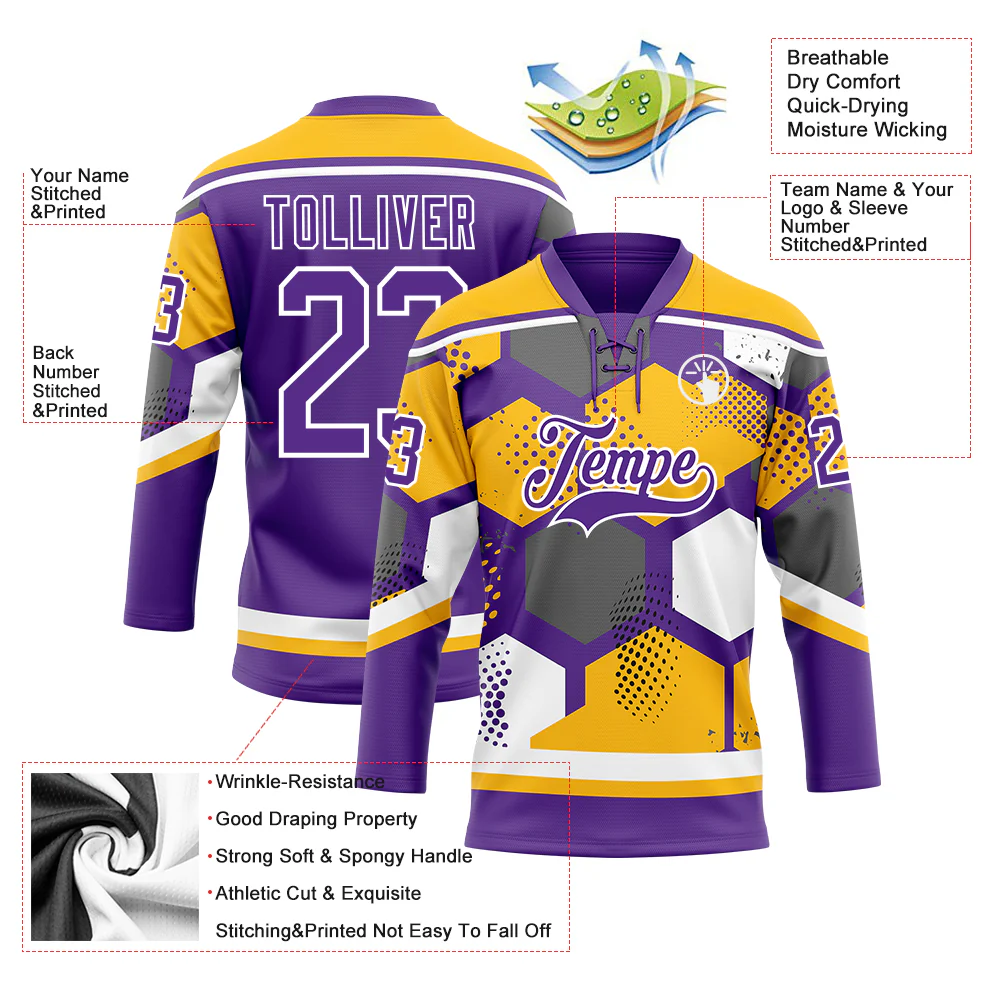 Custom Gold Purple-White 3D Pattern Geometric Shape Hockey Lace Neck Jersey