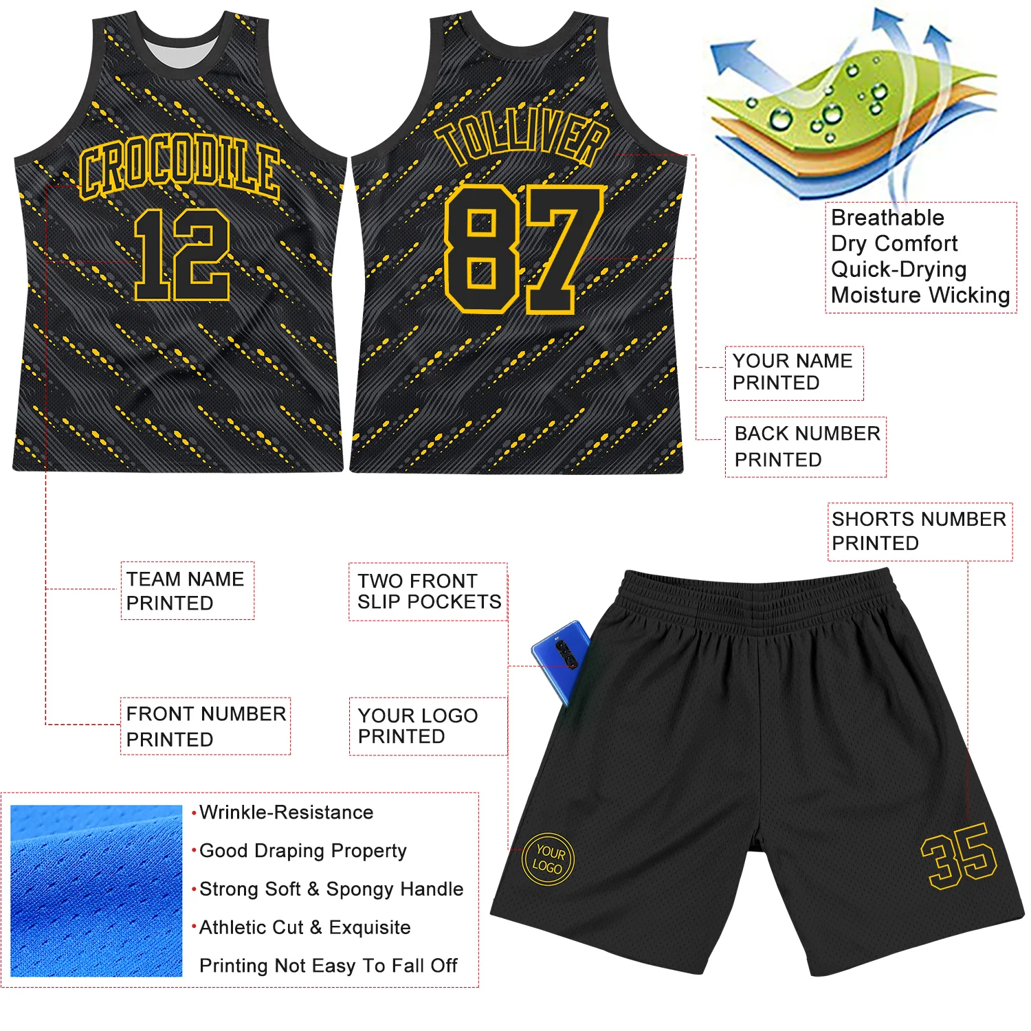 Custom Black Yellow Slant Lines Round Neck Sublimation Basketball Suit Jersey