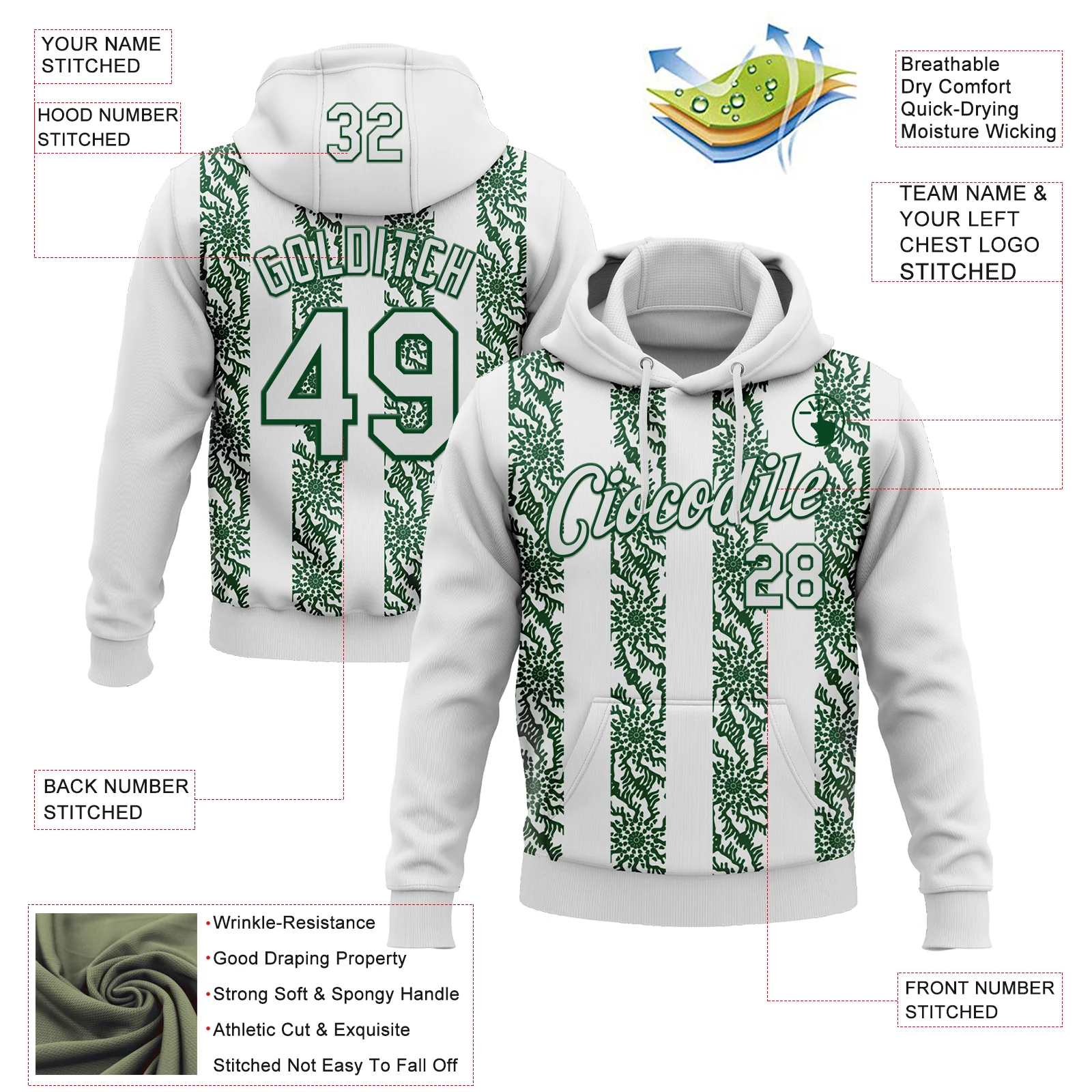 Custom Stitched White Green 3D Pattern Design Abstract Shape Sports Pullover Sweatshirt Hoodie