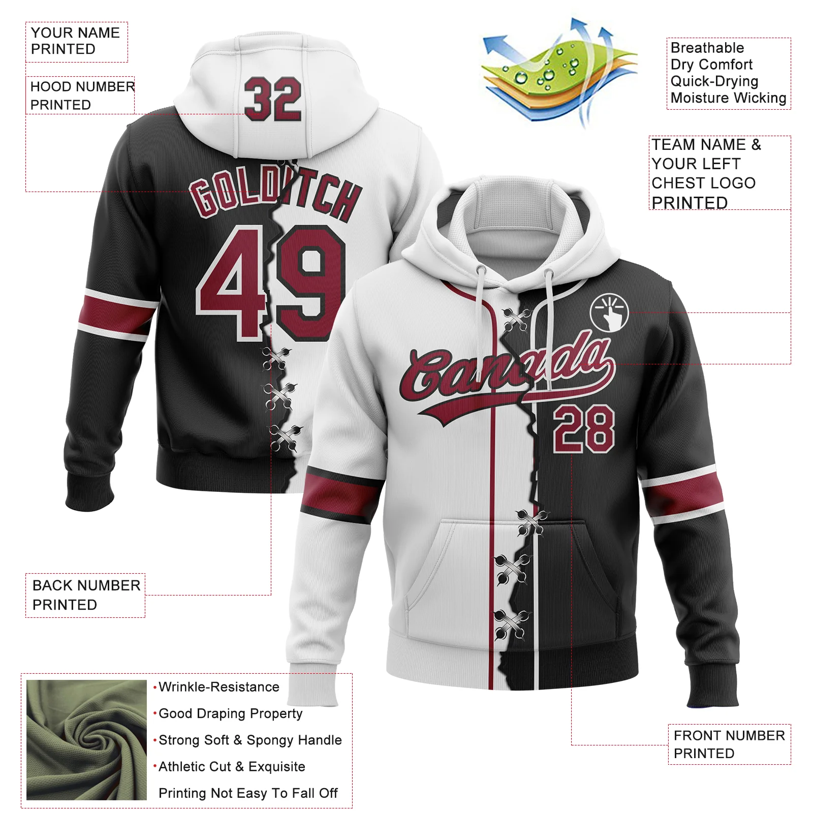 Custom Black Crimson-White Split Ripped Pattern Baseball Pullover Sweatshirt Hoodie