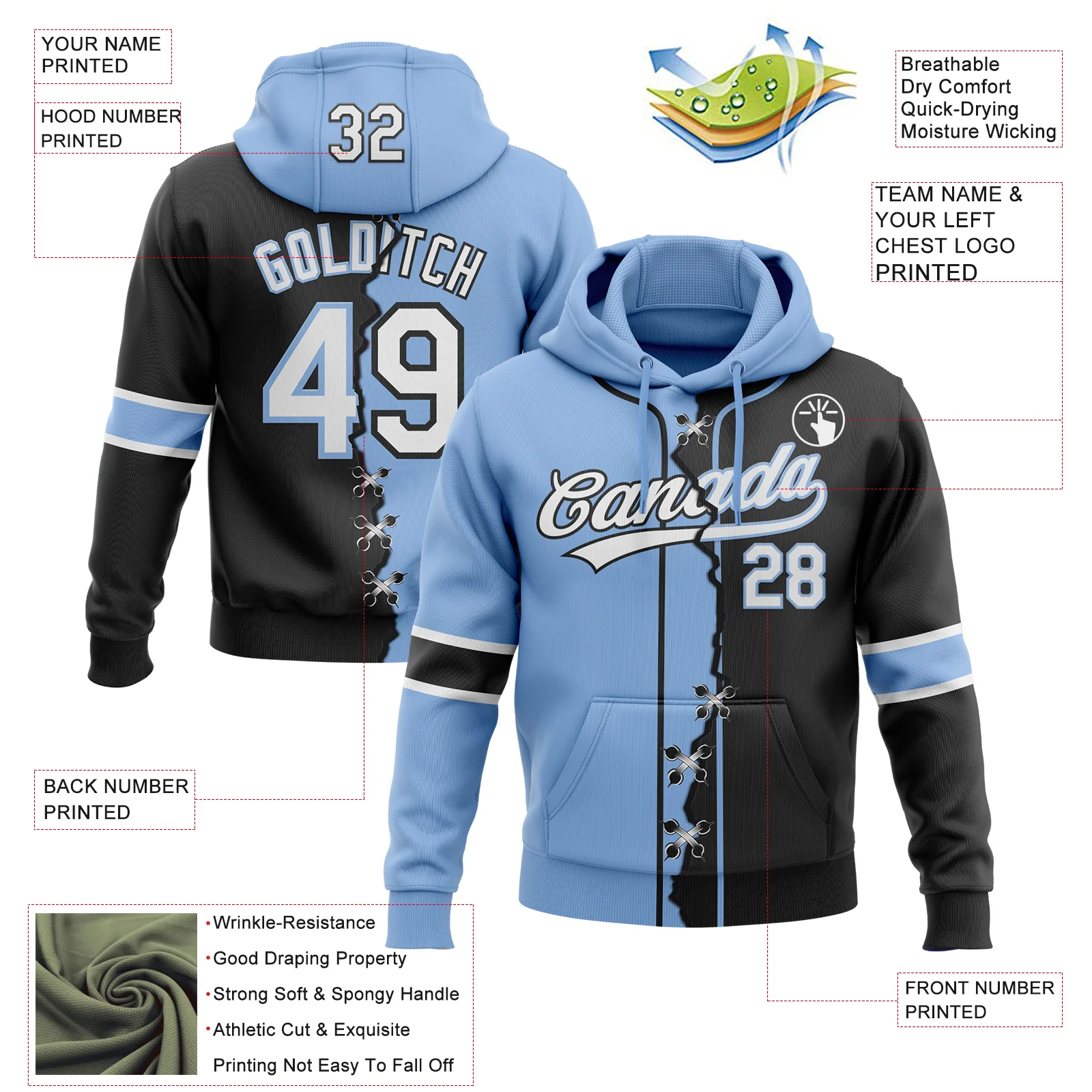 Custom Black Sky Blue-White Split Ripped Pattern Baseball Pullover Sweatshirt Hoodie