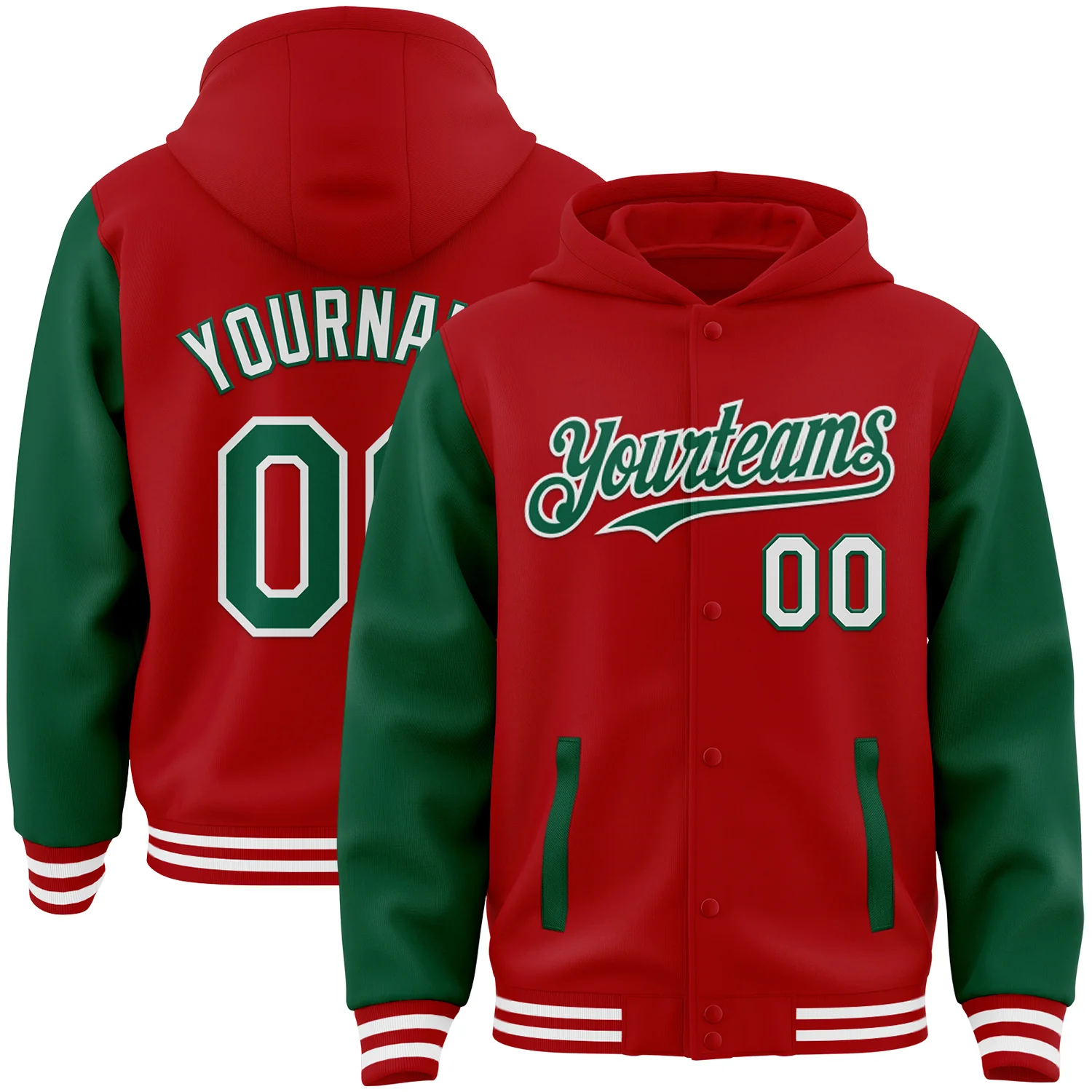 Custom Red Kelly Green-White Bomber Full-Snap Varsity Letterman Two Tone Hoodie Jacket