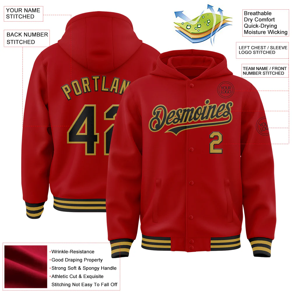 Custom Red Black-Gold Bomber Full-Snap Varsity Letterman Hoodie Jacket