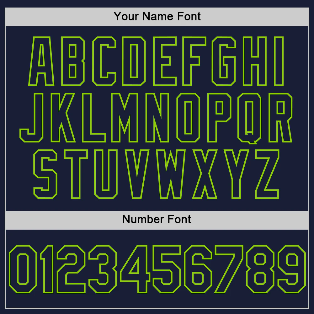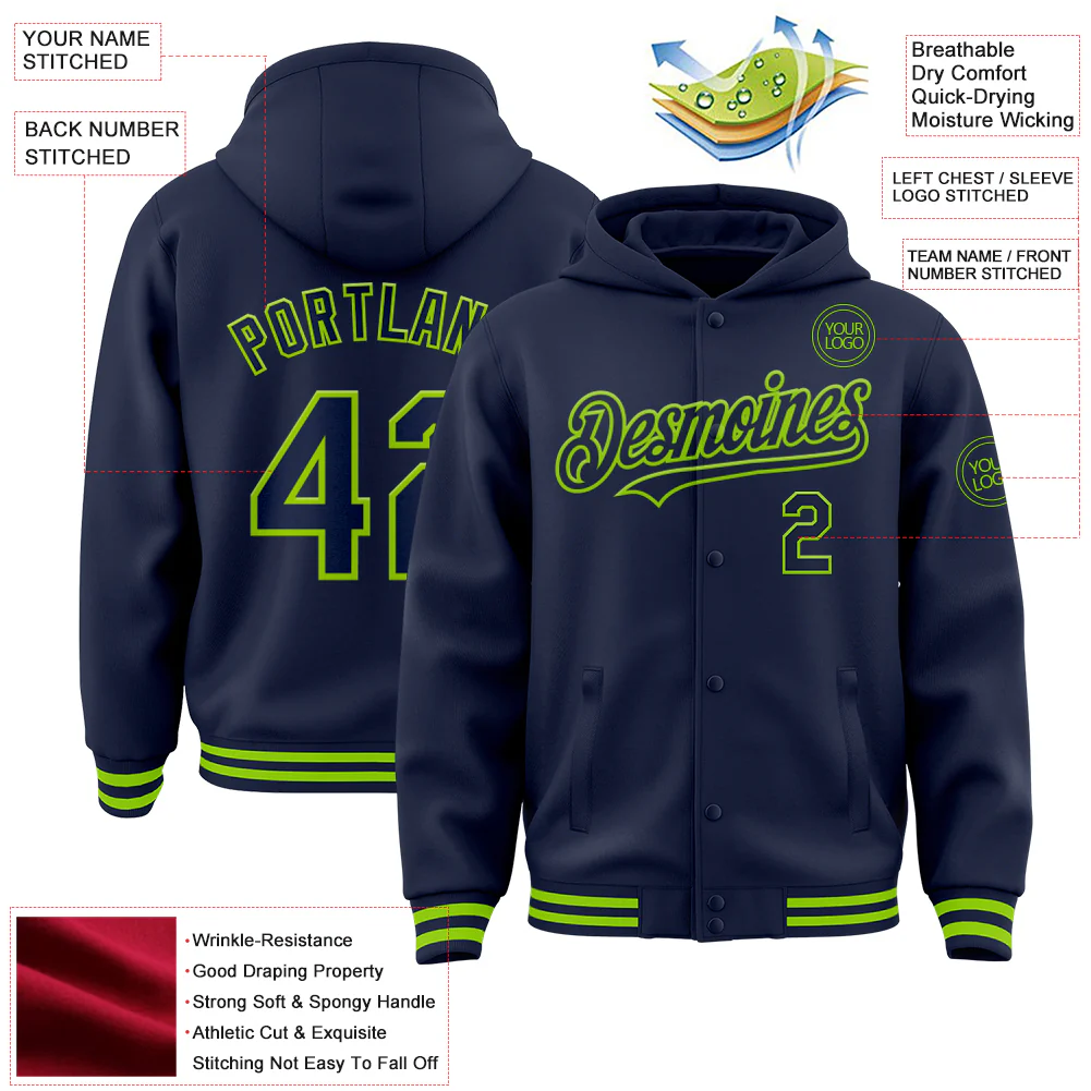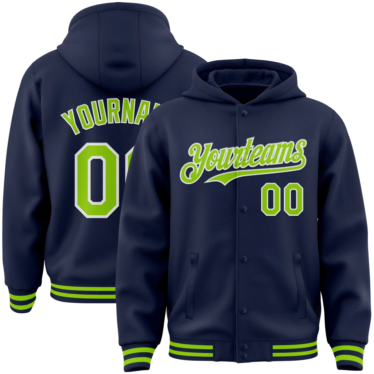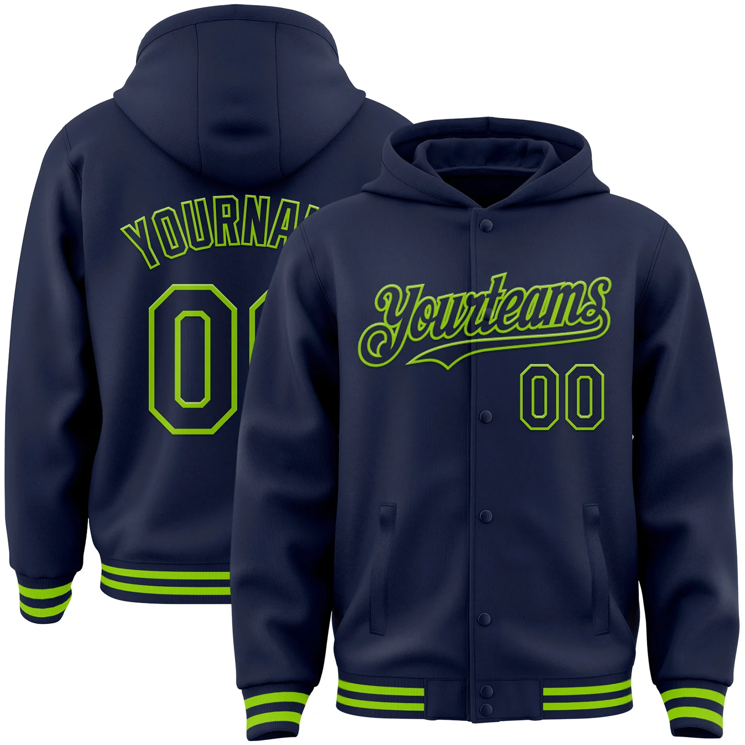 Custom Navy Neon Green Bomber Full-Snap Varsity Letterman Hoodie Jacket