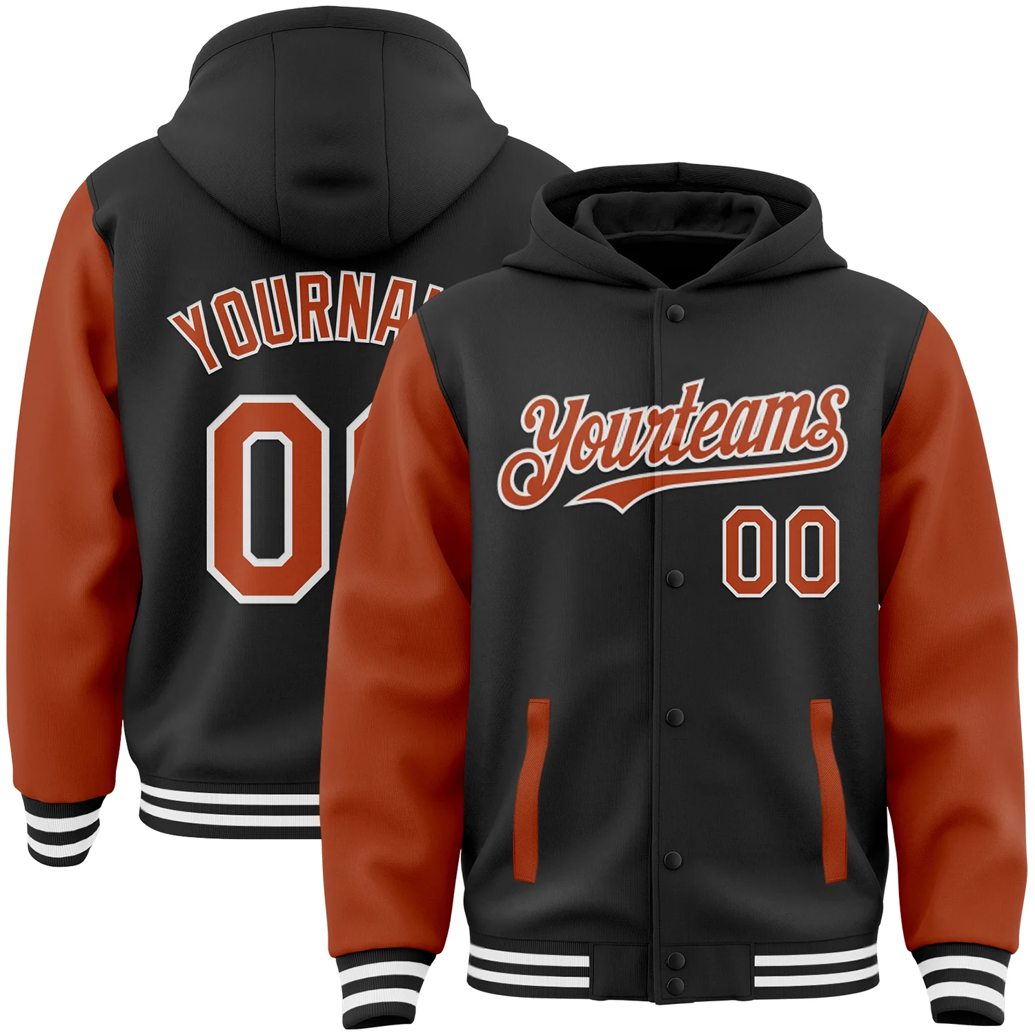 Custom Black Texas Orange-White Bomber Full-Snap Varsity Letterman Two Tone Hoodie Jacket