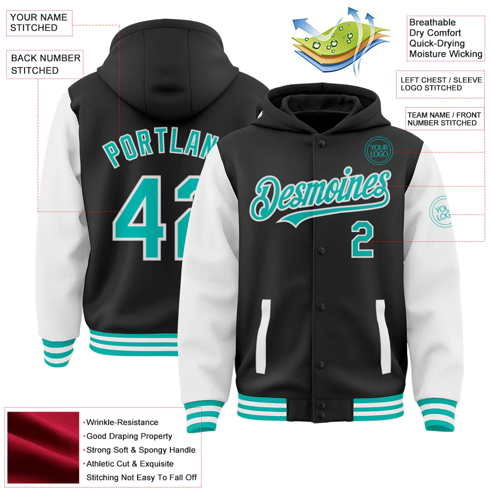 Custom Black Teal-White Bomber Full-Snap Varsity Letterman Two Tone Hoodie Jacket