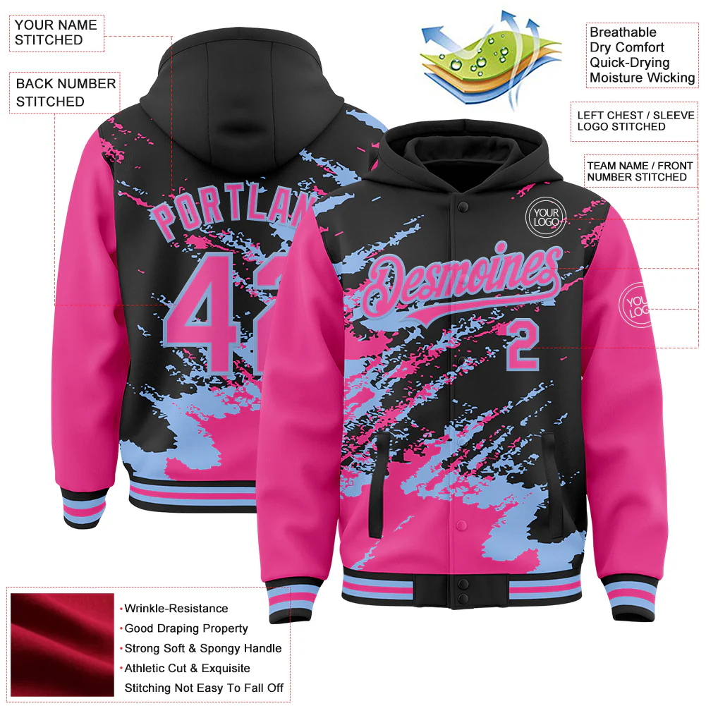 Custom Black Pink-Light Blue Splash Art 3D Pattern Design Bomber Full-Snap Varsity Letterman Hoodie Jacket