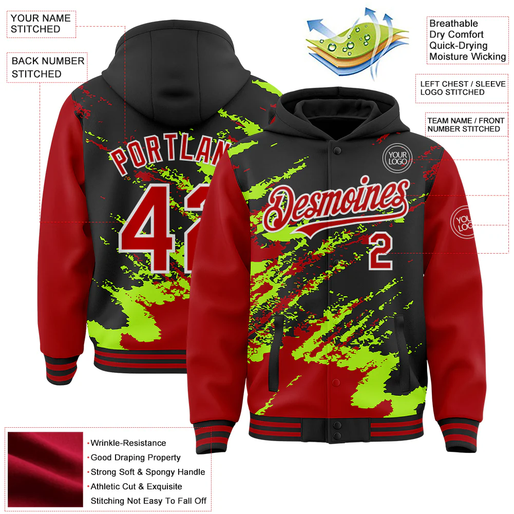 Custom Black Red Neon Green-White Splash Art 3D Pattern Design Bomber Full-Snap Varsity Letterman Hoodie Jacket