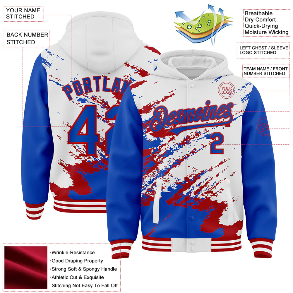 Custom White Thunder Blue-Red Splash Art 3D Pattern Design Bomber Full-Snap Varsity Letterman Hoodie Jacket