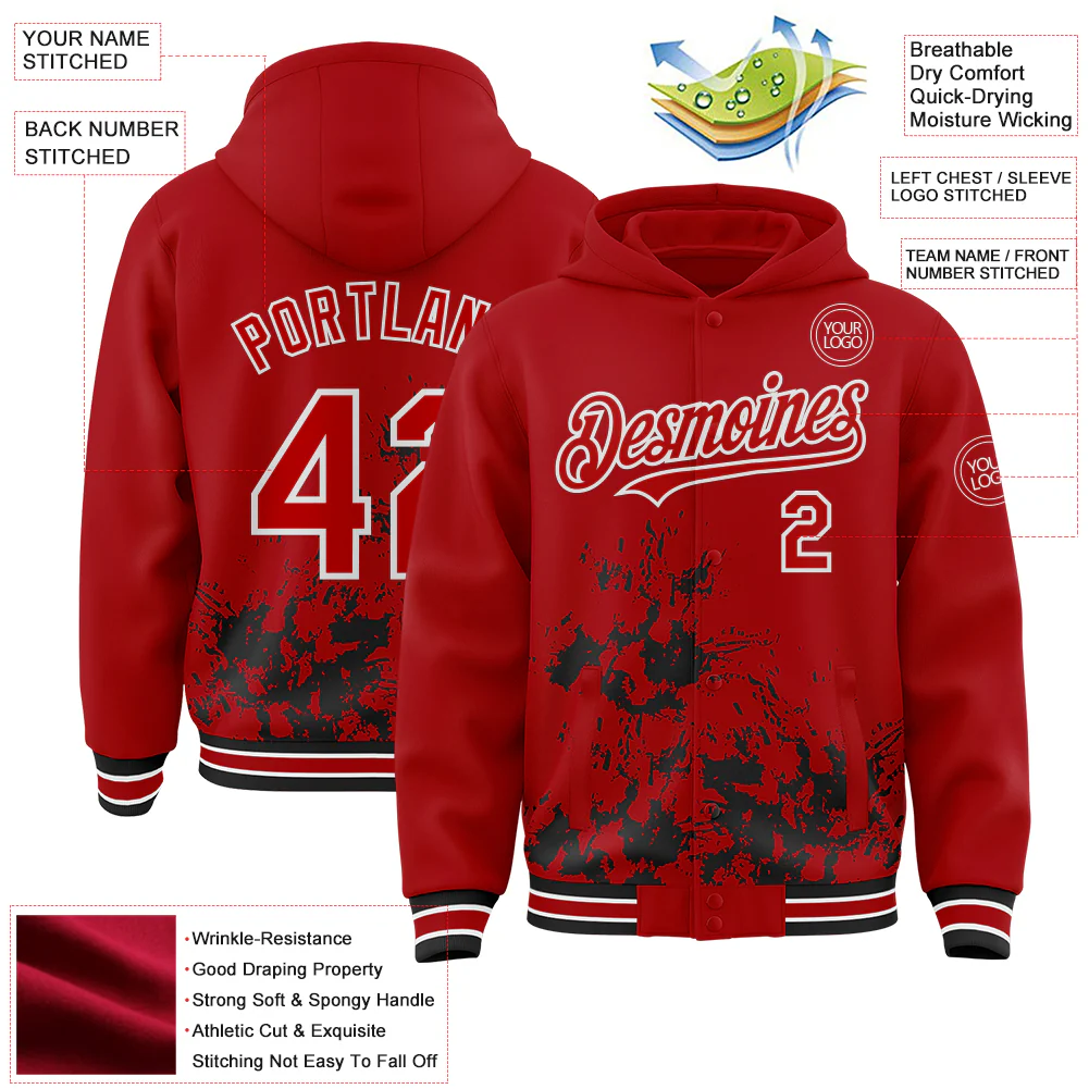Custom Red Black-White Splash Art 3D Pattern Design Bomber Full-Snap Varsity Letterman Hoodie Jacket