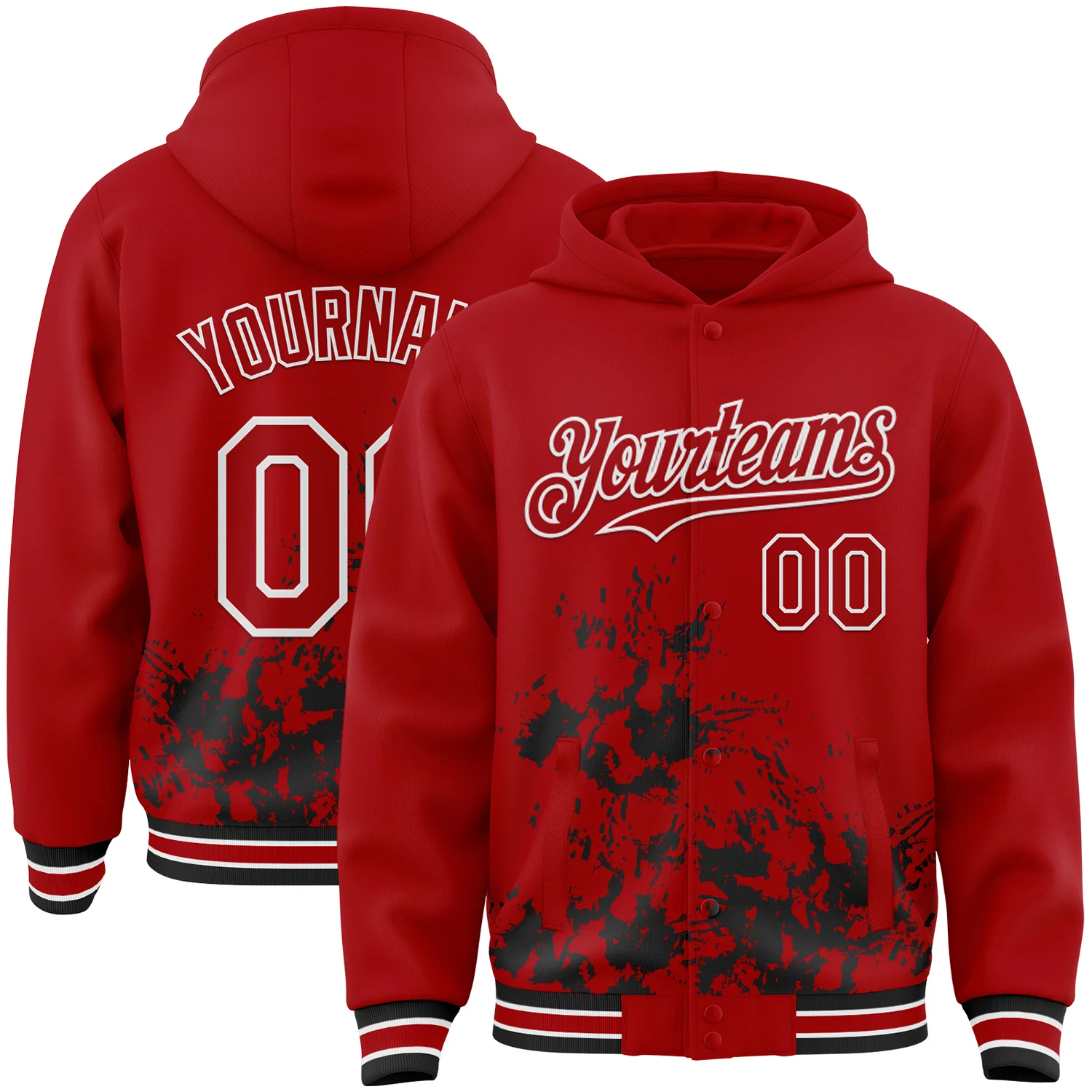 Custom Black Red-White Splash Art 3D Pattern Design Bomber Full-Snap Varsity Letterman Hoodie Jacket