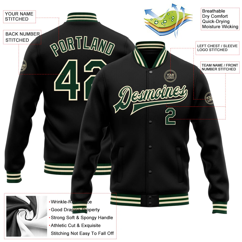 Custom Black Green-Cream Bomber Full-Snap Varsity Letterman Jacket