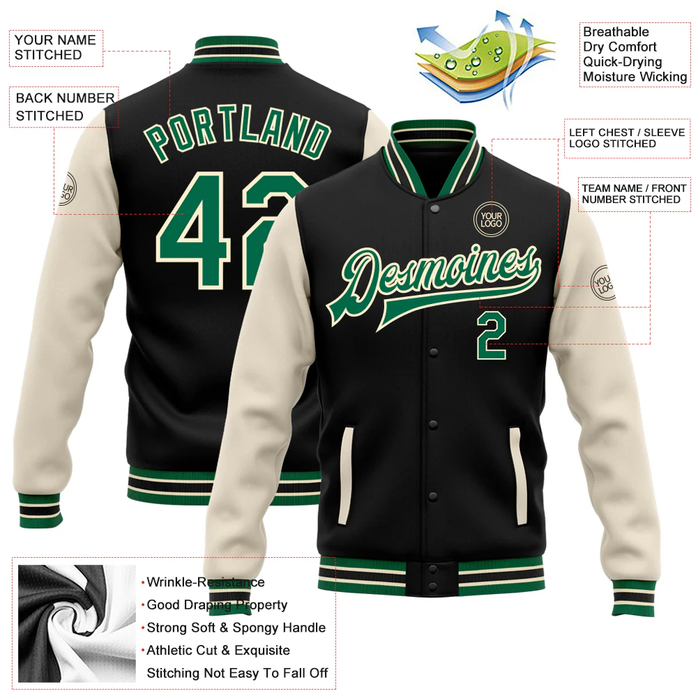 Custom Black Kelly Green-Cream Bomber Full-Snap Varsity Letterman Two Tone Jacket