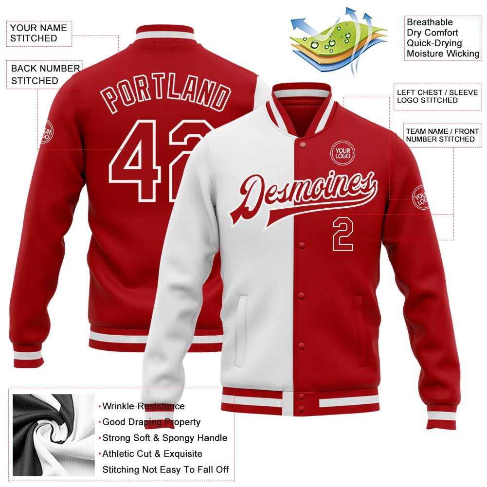 Custom White Red Bomber Full-Snap Varsity Letterman Split Fashion Jacket
