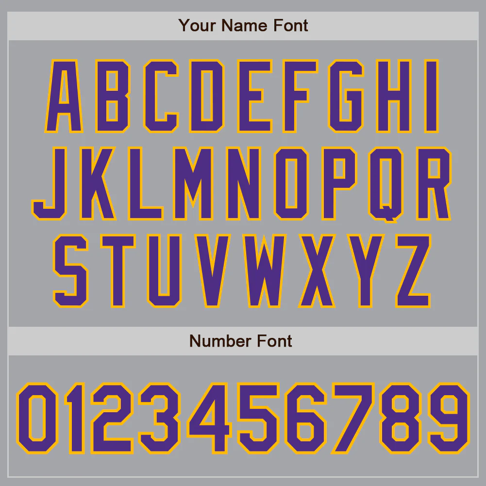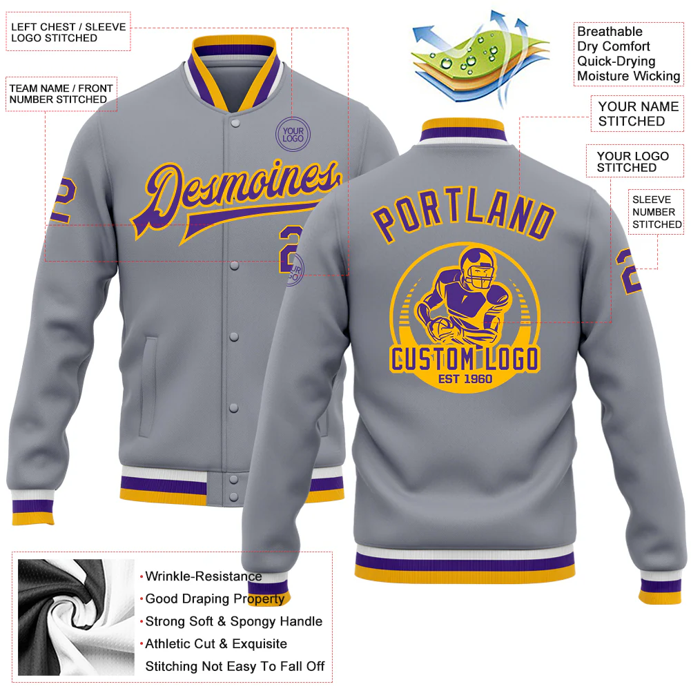 Custom Gray Purple-Gold Bomber Full-Snap Varsity Letterman Jacket