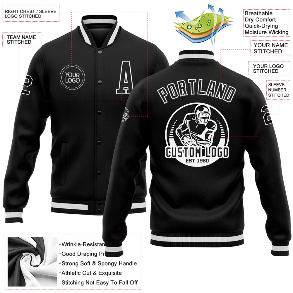 Custom Black Black-White Bomber Full-Snap Varsity Letterman Jacket