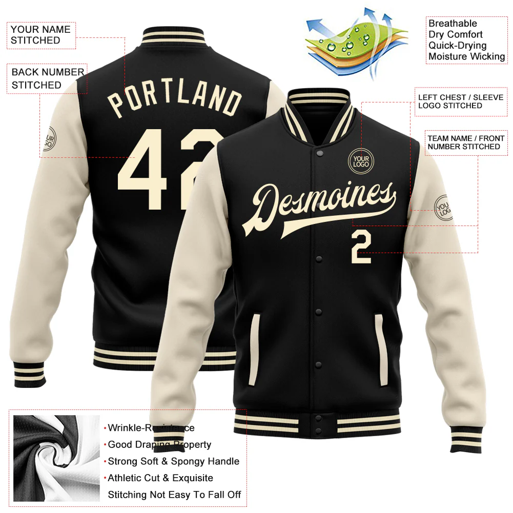 Custom Black Cream Bomber Full-Snap Varsity Letterman Two Tone Jacket