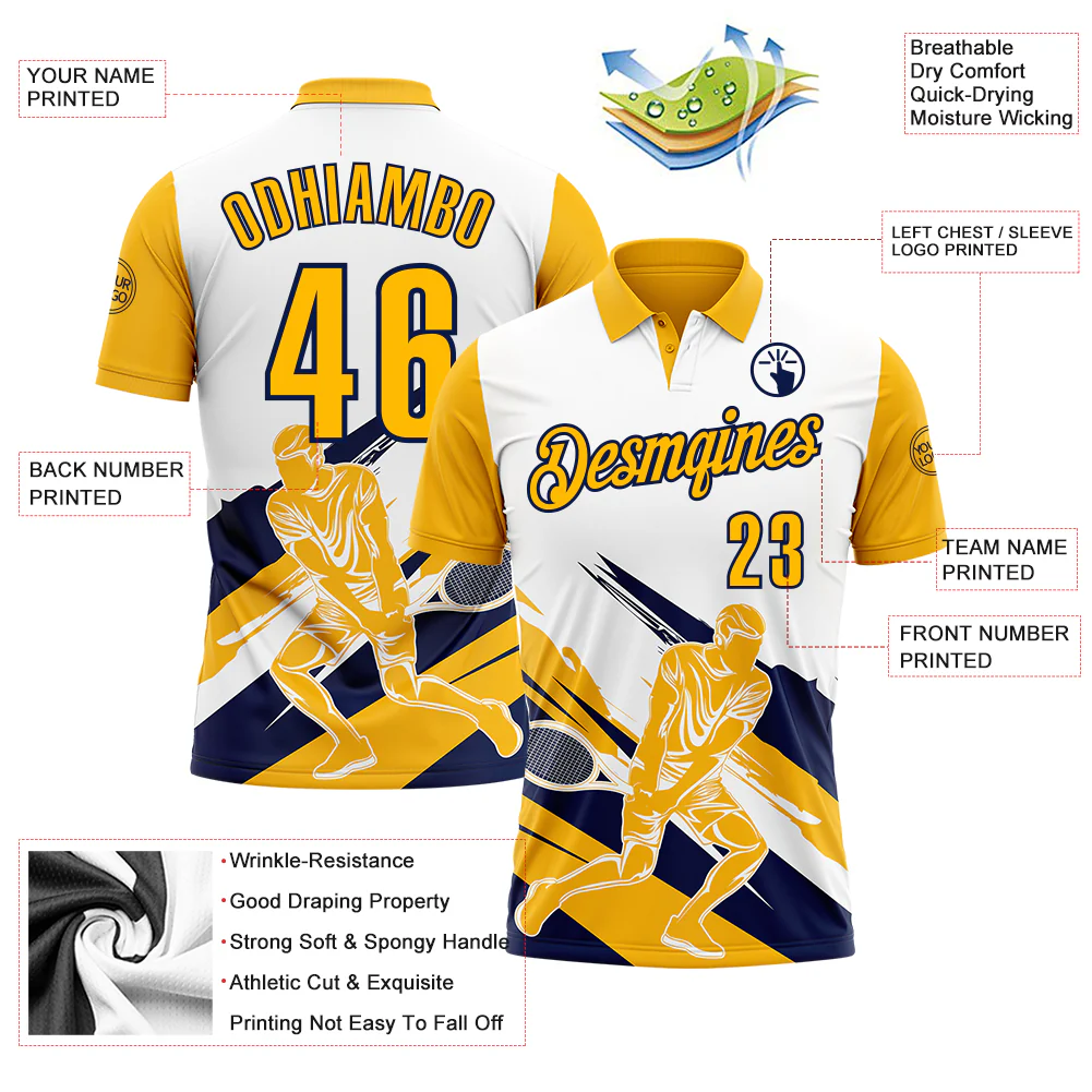 Custom White Gold-Navy 3D Tennis Performance Polo Shirt